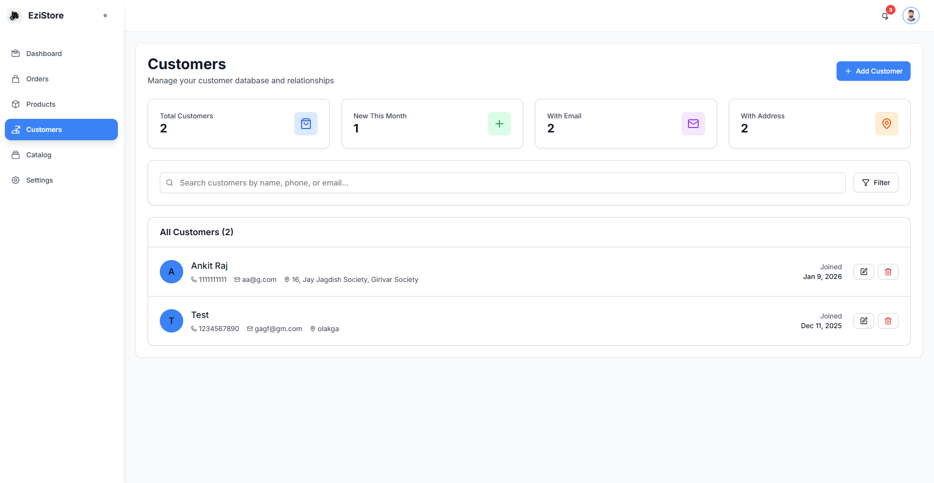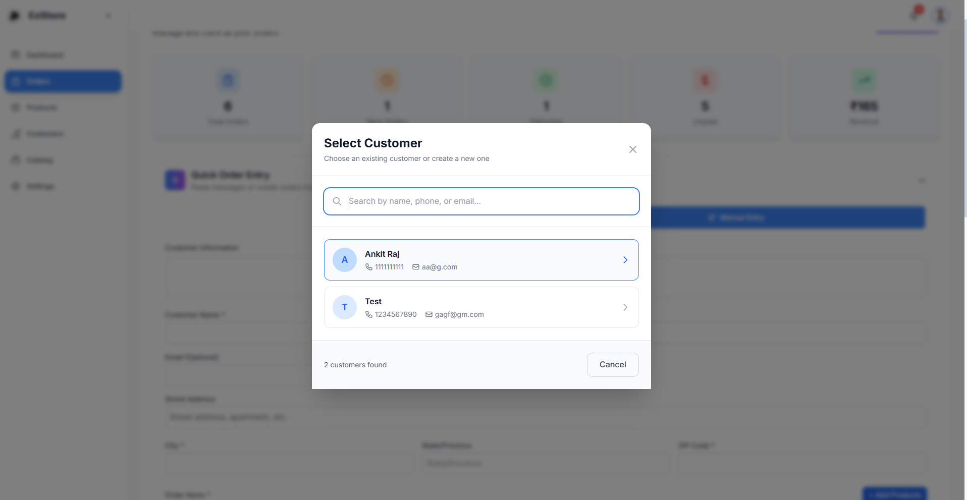 When creating a new order, start typing a customer's name or phone number, and EziSeller will suggest existing customers. Select one to automatically populate their information.
