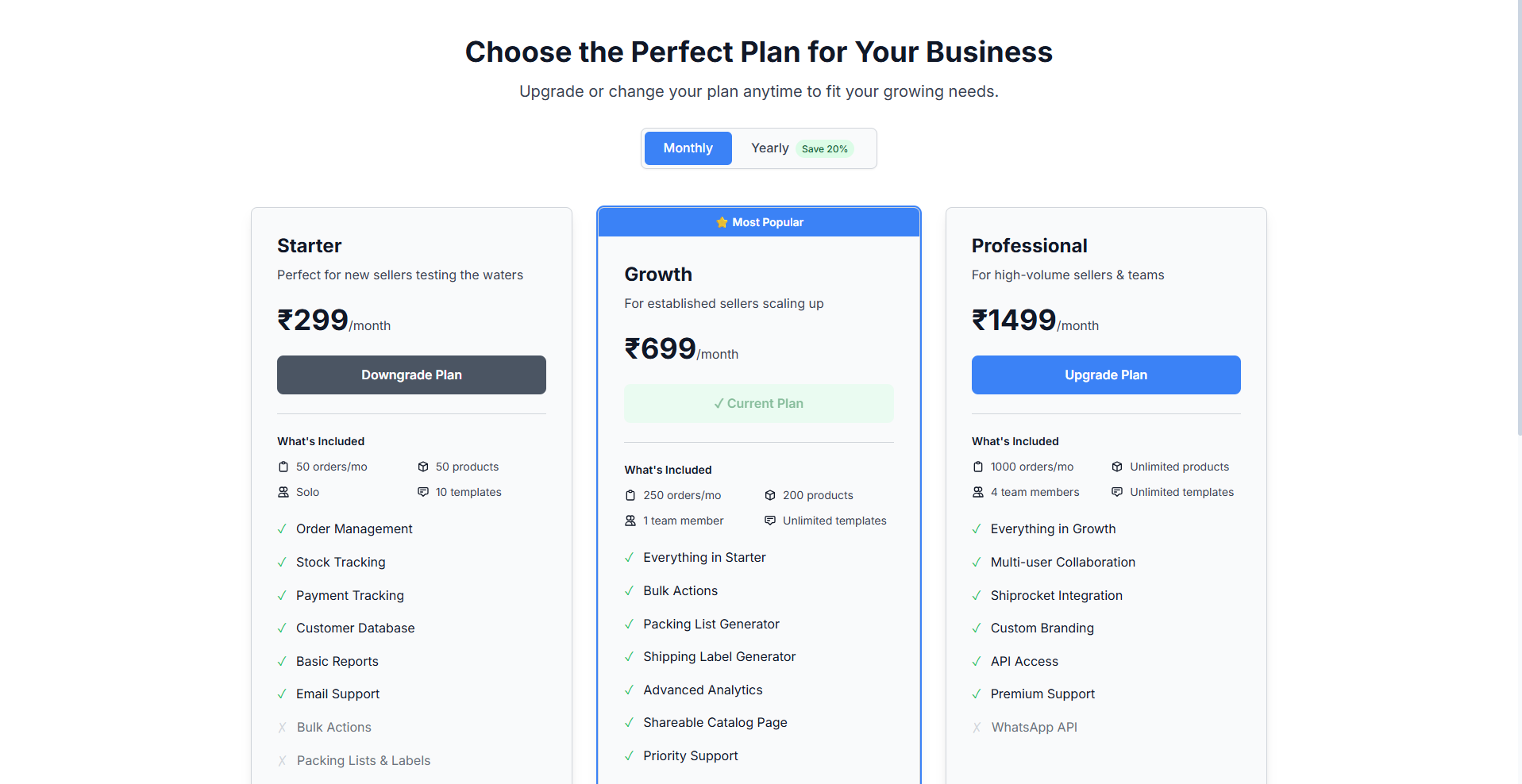 A: The Catalog feature is available on Growth (₹699/month) and Professional (₹1,499/month) plans. Upgrade from Settings > Billing to unlock it.
